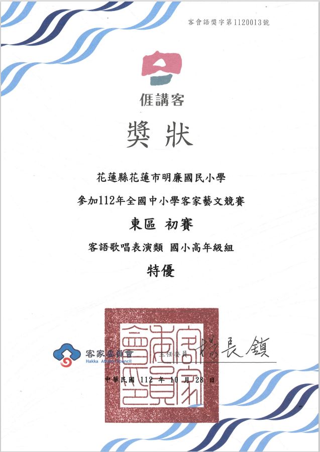 恭喜合唱團榮獲112年度全國中小學客家藝文競賽東區初賽歌唱表演類國小高年級組特優!(代表宜花東參加全國賽)