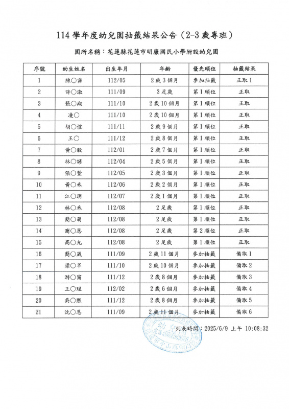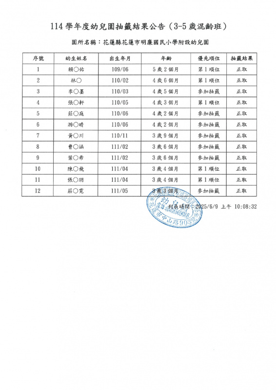 114學年度新生抽籤結果公告如下: