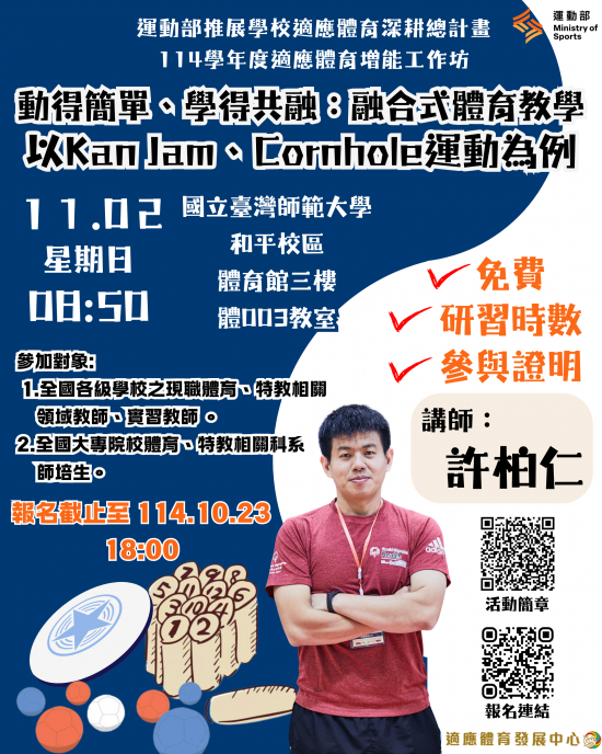| 二、 | 為推動學生於校園及社區多元共融發展,透過專題講座及布袋球、飛盤和芬蘭木柱等體驗活動,以增進教師規劃及執行融合式體育活動之實務經驗與專業知能,特委請國立臺灣師範大學辦理旨揭活動。 |