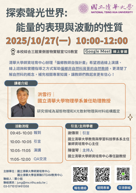 轉知:「偏鄉教師自強計畫-探索聲光世界: 能量的表現與波動的性質」線上講座。