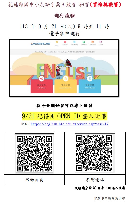 1、 | 報名方式:用花蓮縣OPEN ID進入競賽系統後,點選COMPETE(我要參賽)-113年度學生英語字彙王競賽-參加初賽後,即可開始。 |
